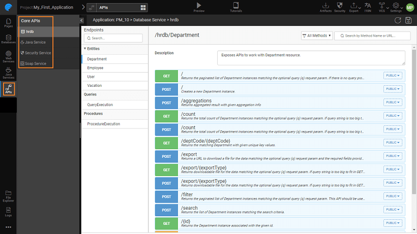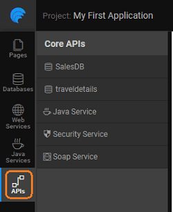 From WaveMaker's API Designer, one can view the various Database and Java Service APIs that are available to your application. You can access the API Designer from the Resources Panel. You can use this designer for:
