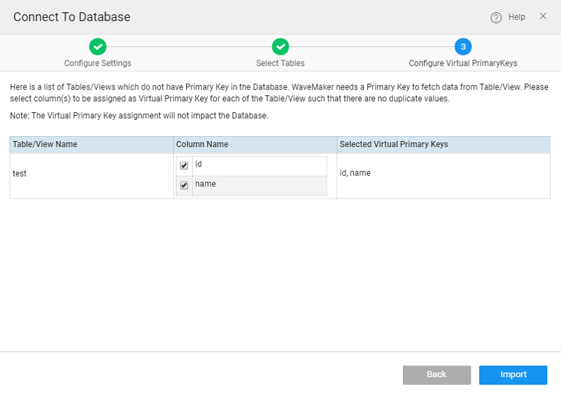 When connecting to an external Database, if the tables do not have Primary Key, you will be given an option to assign a Virtual Primary Key.