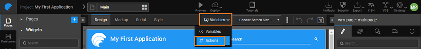 • Select the Action option from Variables on the Workspace Toolbar