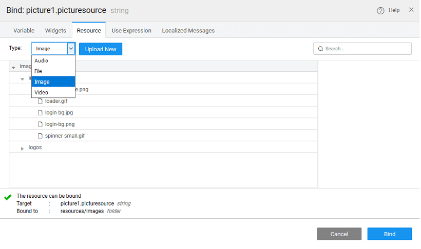 From the Property panel of the media widget, find the Audio section. Locate the MP3 Source Path option and click the Bind icon represented by a chain-link as shown in the picture below; a Bind modal dialog pops-up.