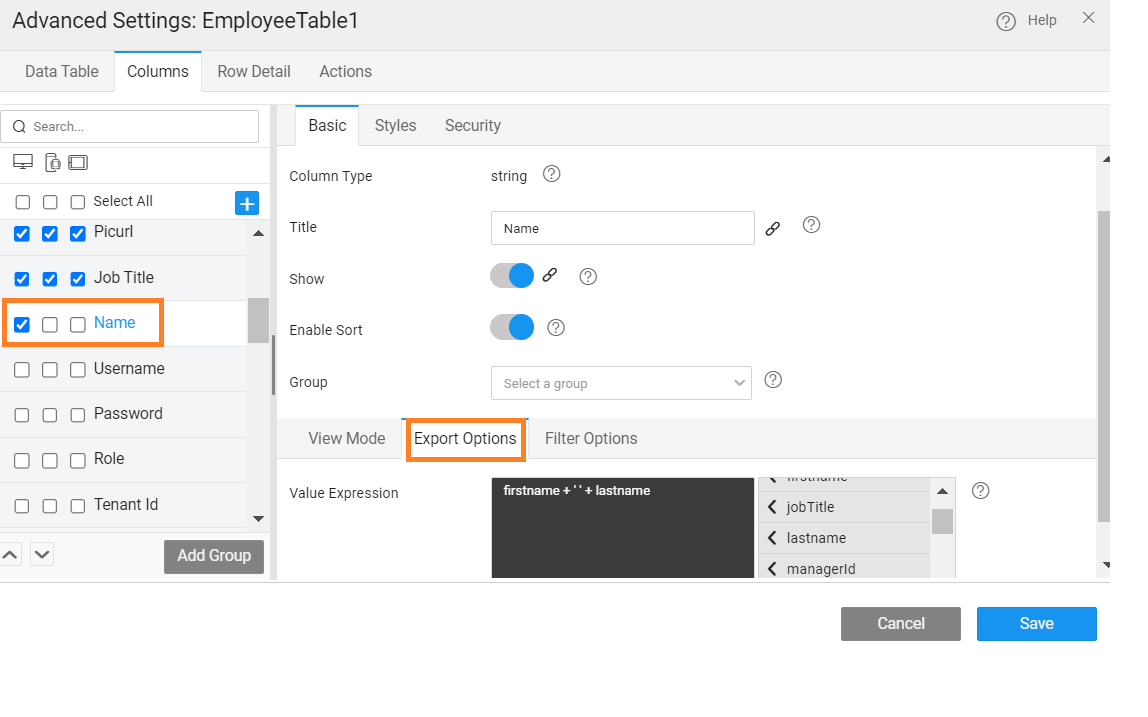In the case where the export option is set by selecting the Export Format as EXCEL or CSV, the Export Options can be used to customize the export values by setting the Value Expressions. This is particularly useful to display name column as a combined value like 'firstname+lastname' while export.