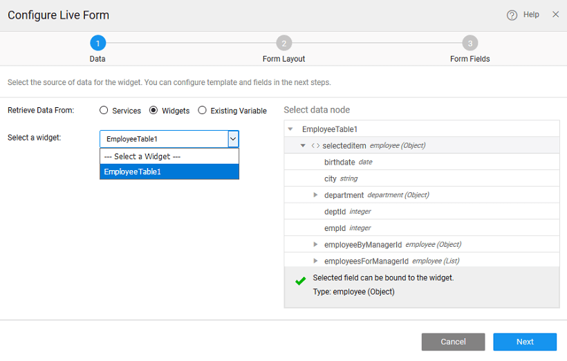 The first step in configuring a Live Form is to define the data that needs to be displayed. This data can be in the form of a Variable or another Widget.
