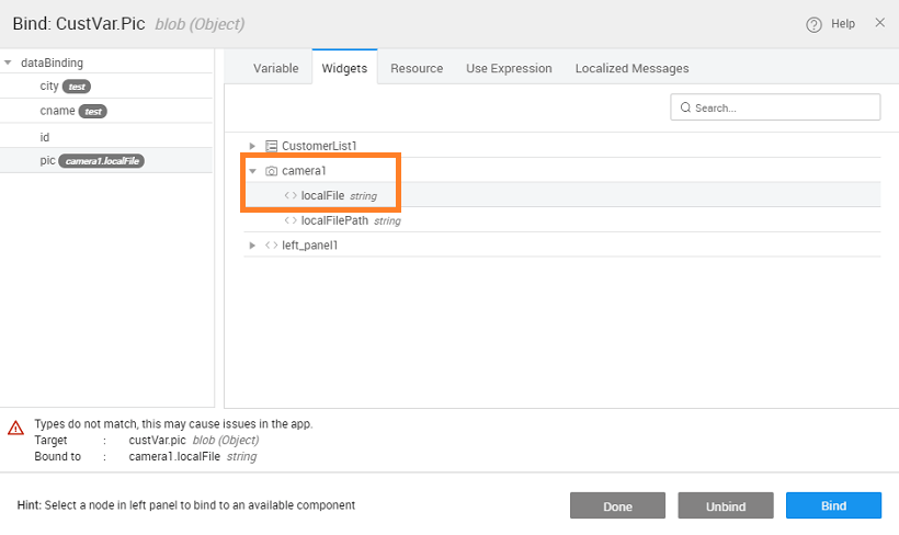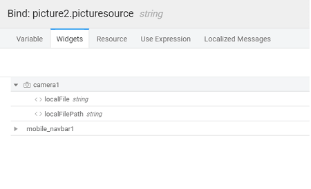 - Bind the source of the picture to the ‘localFilePath’ of camera widget.