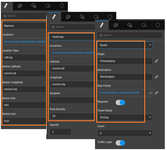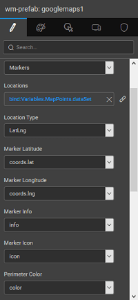 - Markers help to mark a given location with an icon, information, highlight using a circle of given radius and shade(color). The input can be any variable which has the above-mentioned fields delimited. The variable can be bound to the Locations property and each of the above properties can be set to the elements of the variable.