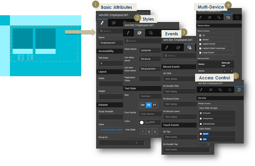 Define the content to be displayed in a widget by connecting it to a database query, web service, Java method, or another widget. Data binding provides integration with data sources known as ‘Variables’ or any other Widgets. Variables offer the ability to integrate with services such as a database, web service or any other backend service. More on Variables and Binding.