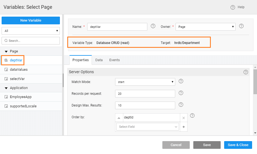 2. Bind the Select widget to a database. Here we are using the Department table from the hrdb, import the sample db that comes shipped with Studio and has been imported earlier and Create Database CRUD Variable