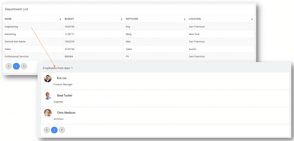 2. Use Data Table widget for Department details and List for Employee details.