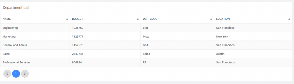 1. Department page listing the departments in a Data Table,