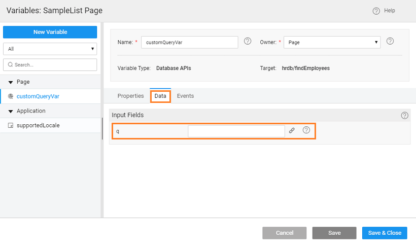 Notice in Data tab of the Service Variable q Input Field. This will be used to construct the dynamic where clause on Employee for findEmployees method.