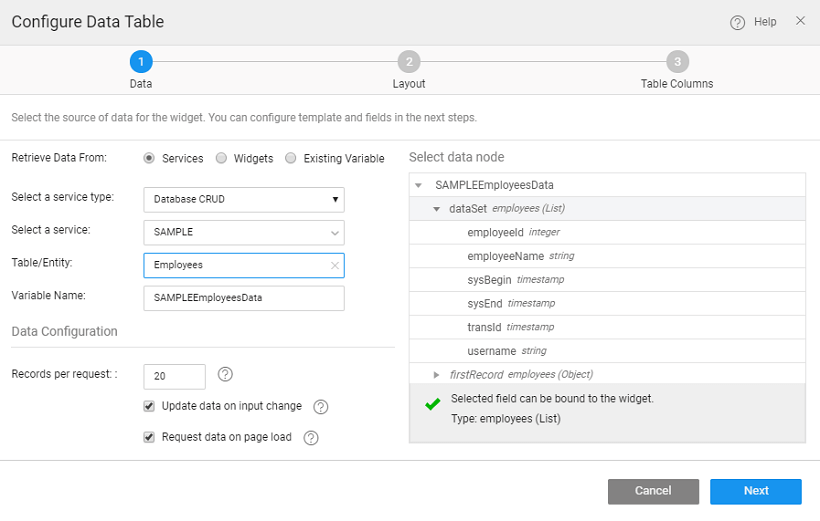 3. Drag and drop a Data Table and set the data source to the variable created in the above step. We chose a Read-Only table to display Employee Id, Name and Department.
