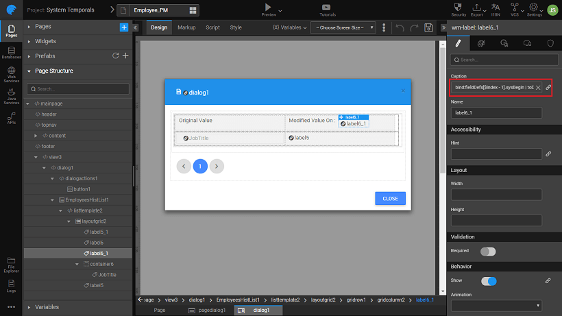 • Using the Use Expression, set the Title of the Dialog to 'Historical Data for: ' + Variables.SAMPLEEmployeesHistData.dataSet.data[$i].employeeName