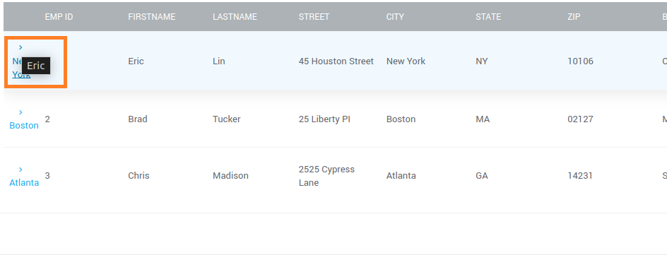 For example, if a user binds the Expand Title to row.firstname and the Collapse Title to row.lastname, the runtime display will reflect these bindings when hovering over the row expansion button, as shown below.